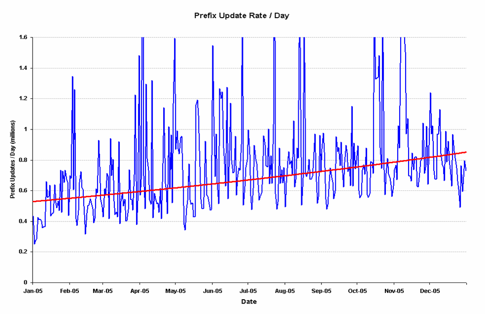 Here the trend across 2005 is visible for updates. The trend line here is an exponential curve best fit, with an overall growth trend from 570,000 prefixes updated per day at the start of the year to some 850,000 prefixes being updated each day by the end of the year. Again that is a very high growth rate, and it should also be remembered that there are, on average some 165,000 unique prefixes in the Internet's routing table. Clearly some prefixes are evidently generating a very high number of updates on a daily basis.