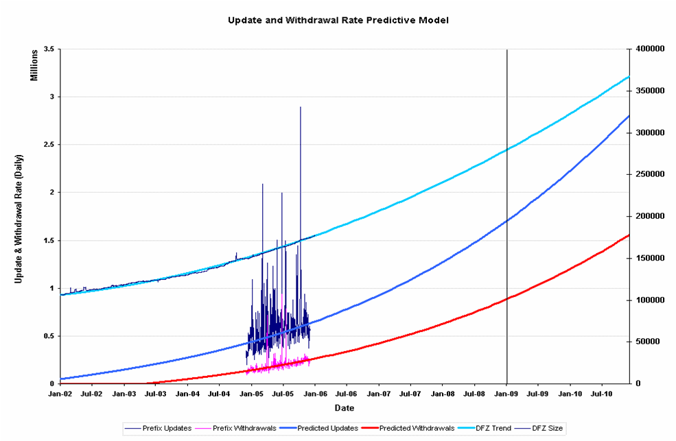 The projections of BGP activity from this model indicate a growth rate of some 1.7 million prefix updates per day by the end of 2008 and 2.8 million prefix updates per day by the end of 20010. That's four times the update rate as of the end of 2005. A similar growth trend is forecast for prefix withdrawal rates, to 0.9 million withdrawals per day by the end of 2008 and 1.6 million withdrawals by the end of 2010. This implies a CPU processing load that will increase by a similar factor over this 3 to 5 year period.