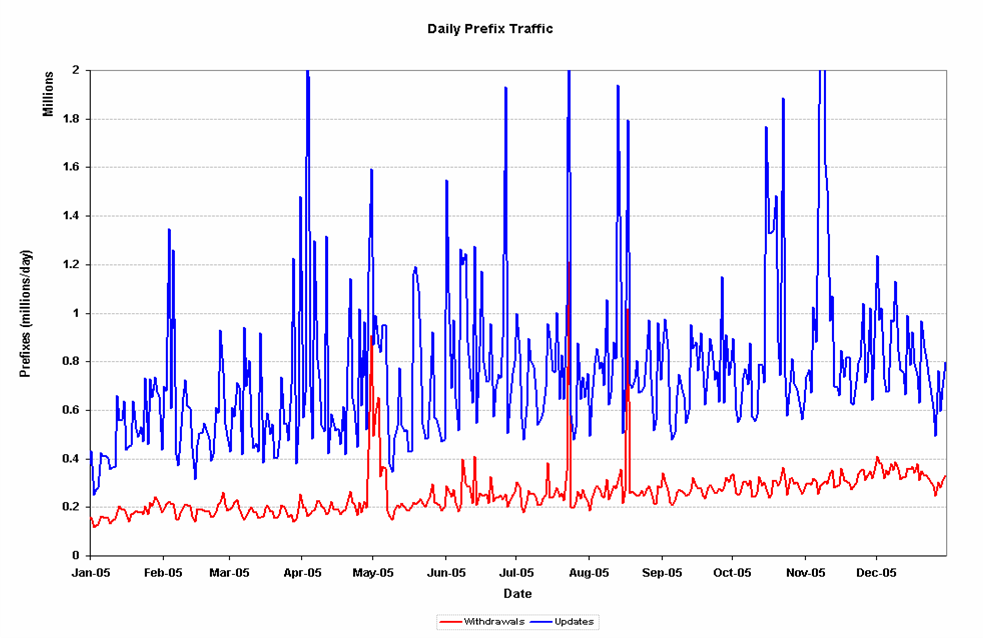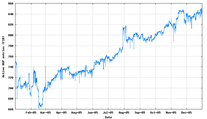 There are a large number of measurements of the BGP routing table that can describe the dimensions and dynamic characteristics of the inter-domain internet. Here I'd like to concentrate on the use and behaviour of the protocol itself, so in this article I will take a look at BGP across the year of 2005, and see how well BGP fared.
