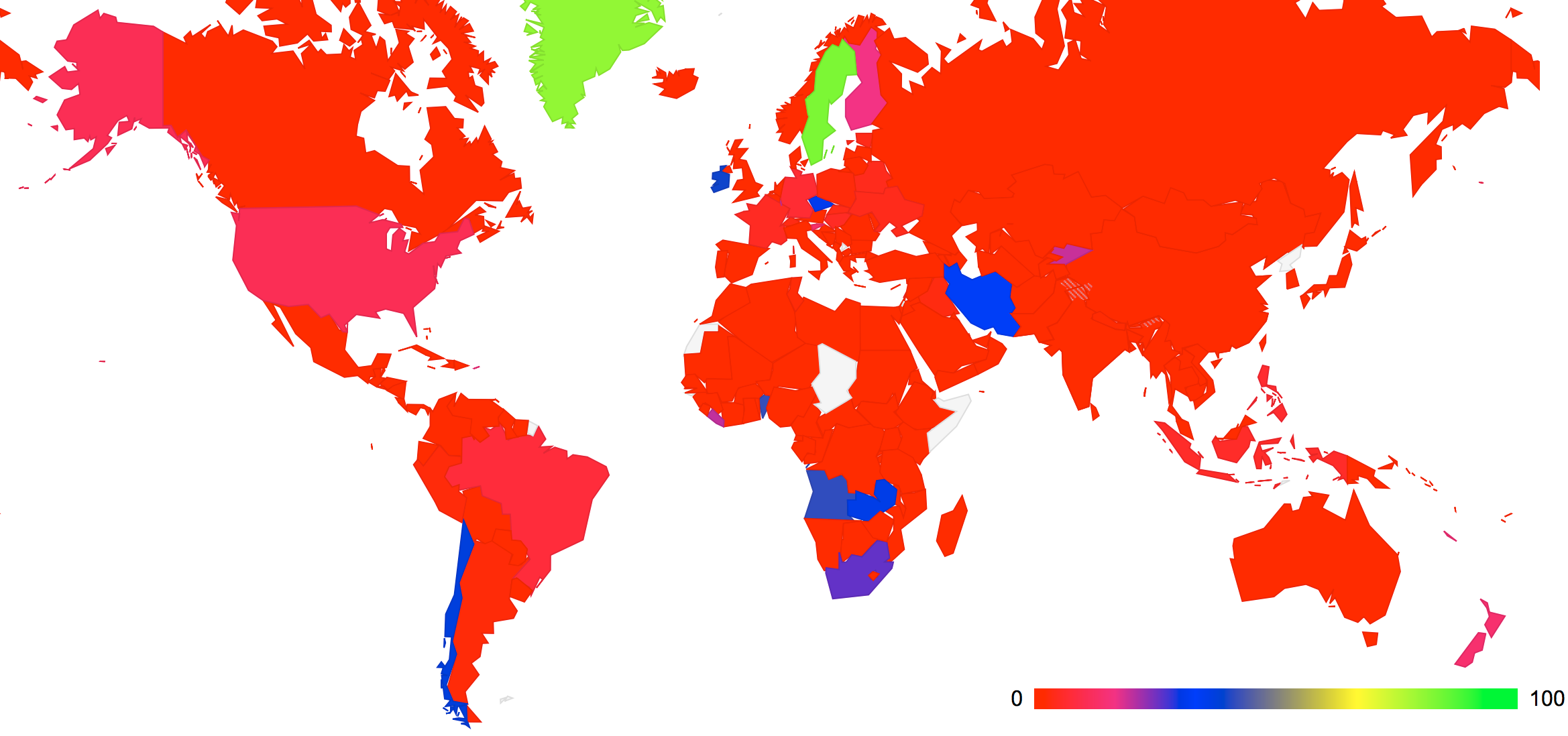 Once again is it possible to feed this data into a map of the world and paint each country with a color that denotes the level of coverage of DNSSEC. This is shown in Figure 4. (The data used to generate this map can be found at http://labs.apnic.net/dnssec/hosts_by_cc_2.txt)