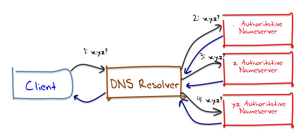 When the client queries its DNS resolver for resolution of a domain name, such as x.y.z, then the DNS resolver, assuming that it has a cleared cache state, would first send this query to a root name server. The server would respond with the set of authoritative name servers for the top level domain z.. The DNS resolver would then send the same query to one of these name servers for z., which would respond with the name servers for the domain y.z.. The DNS resolver will then query one of these name servers for the DNS name x.y.z., and it will then pass the response it receives back to the client. The sequence of DNS queries sent by this DNS resolver after receiving the initial query from the client would be as follows: