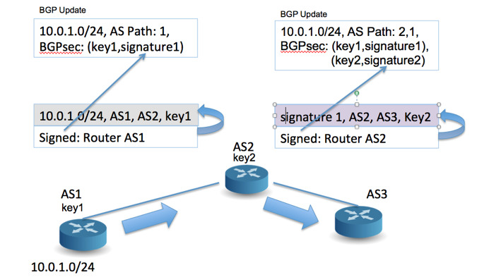 In the BGPsec framework, eBGP speaking routers within the AS have the ability to "sign" a BGP update before sending it. In this case, the added signature "covers" the signature of the received BGP update, the local AS number, the AS number to which the update is being sent, as well as a hash of the public key part of the router's key pair used to sign route updates. The couplet of the public key hash and the signature itself is added to the BGP protocol update as a BGPsec update attribute. As the update traverses a sequence of transit ASes each eBGP speaker at the egress of each AS adds its own public key hash and digital signature to the BGPsec attribute sequence (Figure 3).